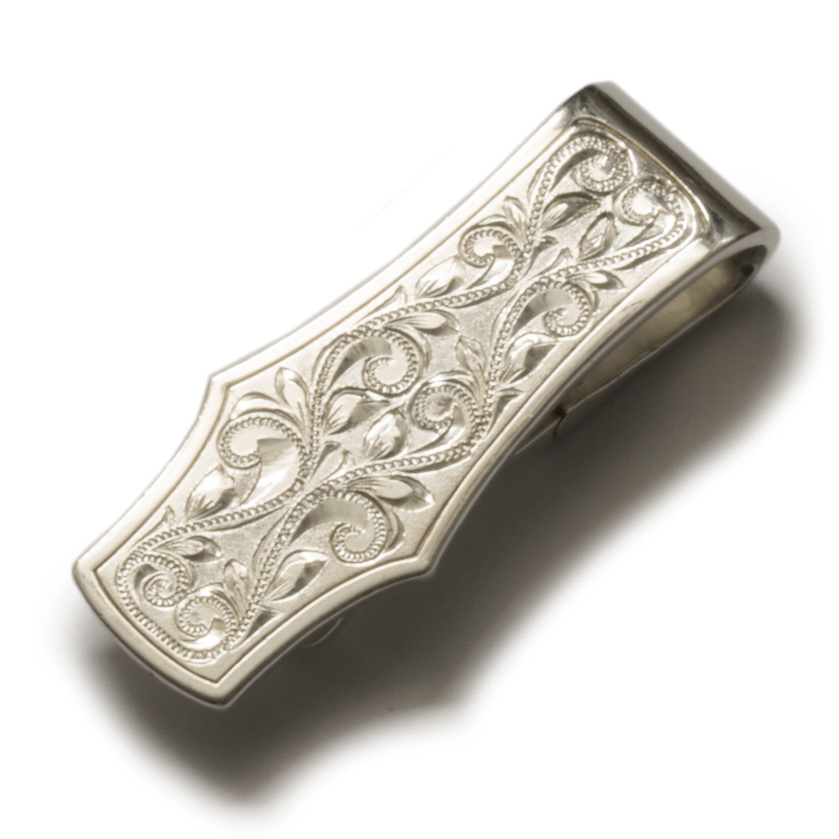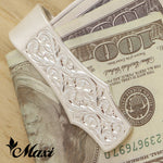 Money clip with hand engraved pattern of Hawaiian maile leaf and waves.