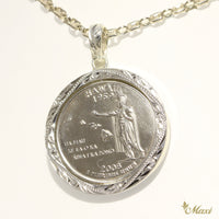 2008年に発行されたハワイがモチーフの25セントコイン。コインに刻印されている年号、1959年はハワイがアメリカ合衆国に加盟した日。肖像はハワイ王国を建国した、カメハメハ1世。刻まれている文字は”UA MAU KE EA O KA ‘AINA I KA PONO”(治世は正義によって永遠に輝く)。